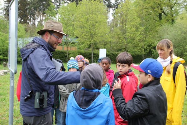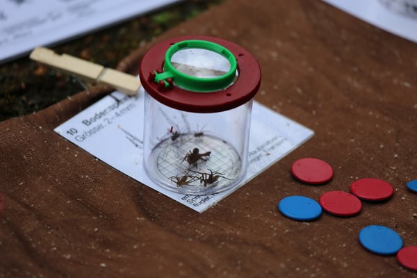 Erdkunderundgang mit Konrad Zeltner im Aegertenbiotop, Bodentiere erkunden, Waldmandalas, Werkarbeiten mit Steinen